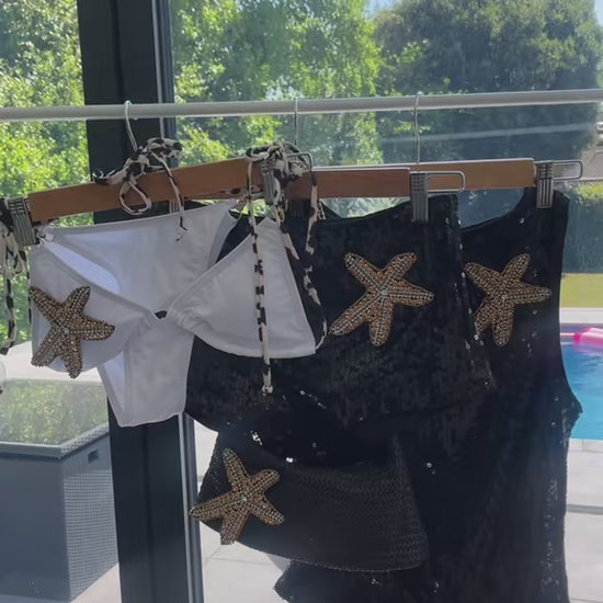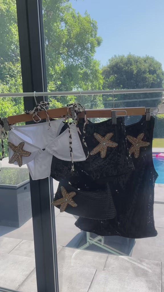 White / gold Gem starfish bikini Contrast Cow print ties - One of a kind